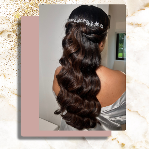 “Lori was honestly amazing not just in the trial and with my wedding hair, but also with my MOH hair! She paid attention to detail and constantly emphasized that she wanted to make sure we were happy with our hair. The glam waves lasted all throughout the night and both my headpiece and veil did not budge one bit! i noticed my hair barely got frizzy and I still had waves the next day. couldn’t be more pleased and happy with a beautiful job well done!” -Gaby