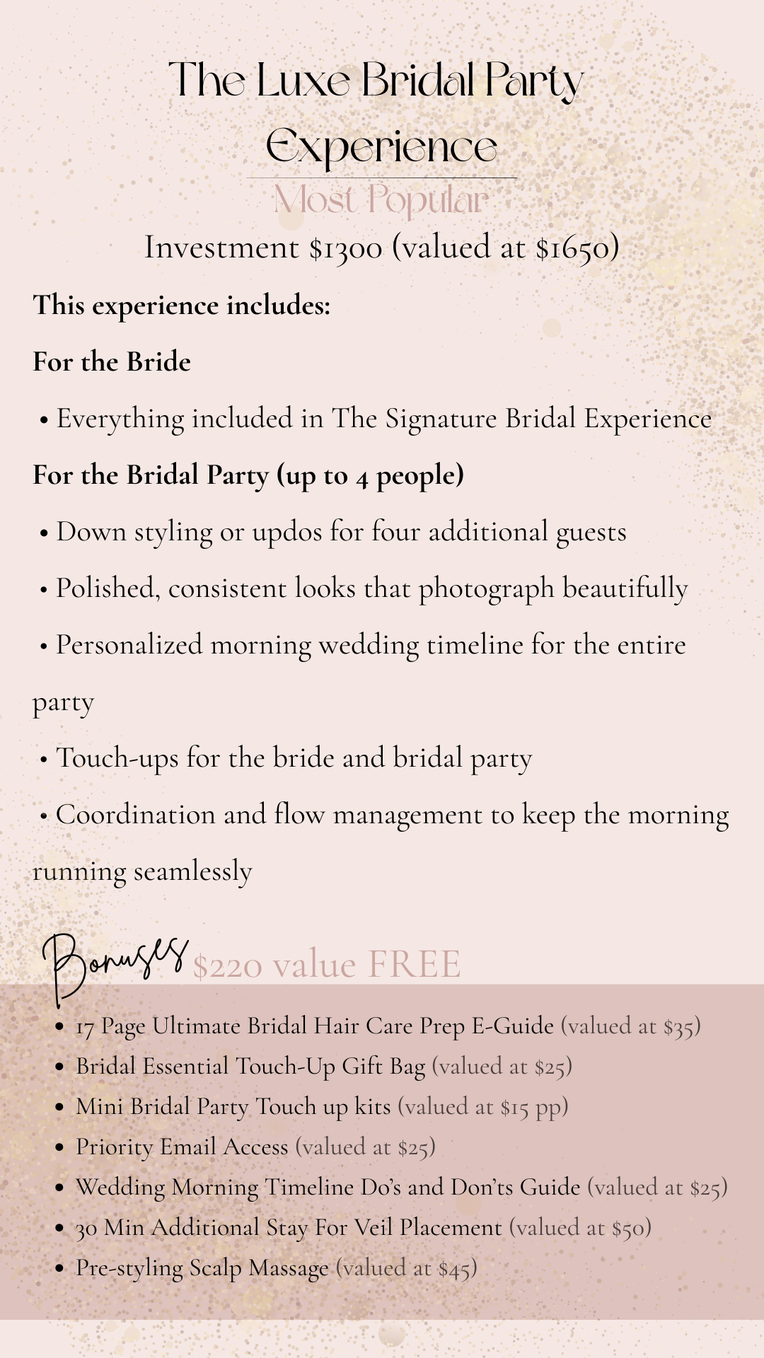 Your wedding morning deserves to feel calm, seamless, and beautifully curated. My bridal packages are designed to give you more than stunning hair — they deliver structure, peace of mind, and a high-touch luxury experience from trial to reception. With custom timelines, expert prep guidance, and on-site support, you’ll feel cared for every step of the way. My goal is to elevate your bridal beauty experience so you look timeless, feel confident, and stay fully present in every moment.